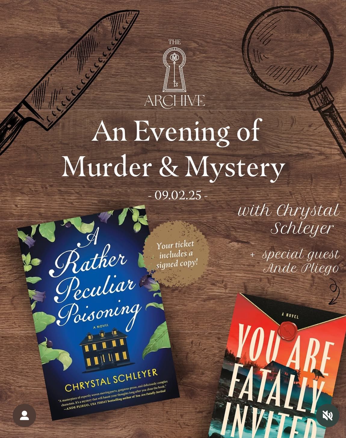 The first is something I’ve been looking forward to for literal years: the launch event of Chrystal Schleyer’s debut novel, A Rather Peculiar Poisoning, a deliciously moody gothic mystery about the world’s most awkward/stressful double engagement party, when someone keeps trying to kill one of the twin brothers engaged.